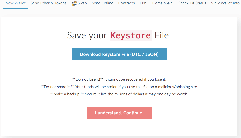 The Keystore file is written in a format known as JSON, and so you’ll occasionally see people refer to this as their MEW JSON file.