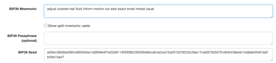 So, we could open the BIP39 tool in one browser tab, and the BIP39 English dictionary in another, and try the first combination, which is: